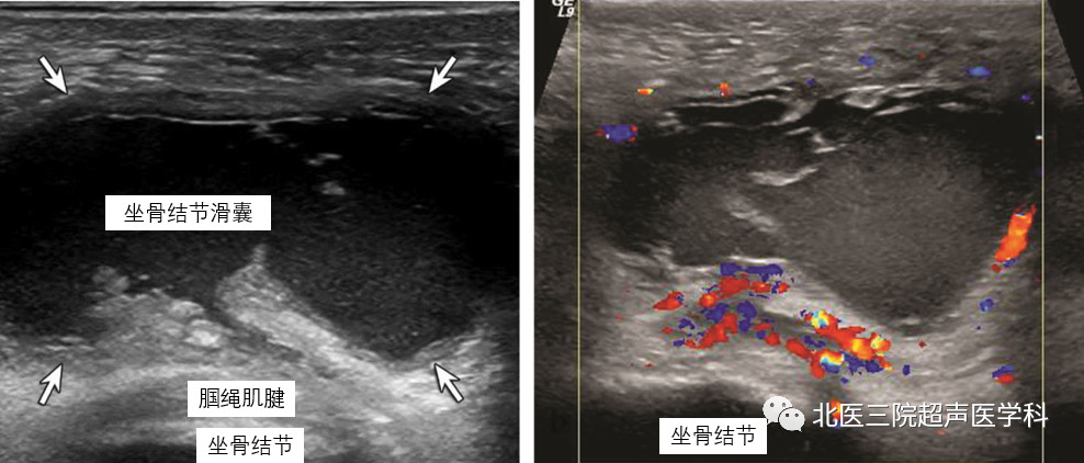 病例3--66岁女性,坐骨结节滑囊炎。灰阶(左图)及彩色多普勒(右图)超声显示位于腘绳肌腱浅方扩张的坐骨结滑囊。