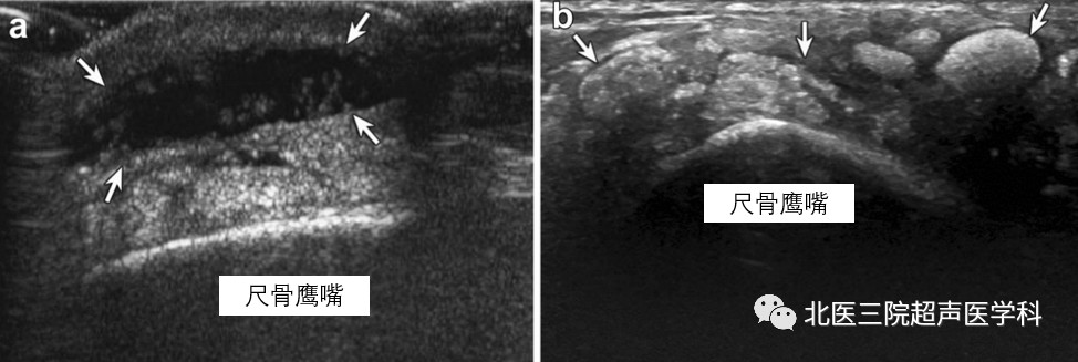 尺骨鹰嘴滑囊:2位不同的患者。左图病例2--66岁男性,外伤所致尺骨鹰嘴滑囊炎。超声显示尺骨鹰嘴滑囊内液体增多,伴滑膜增生(白色箭);右图病例3--63岁男性,痛风性尺骨鹰嘴滑囊炎,扩张的滑囊内可见多发团状高回声痛风石(白色箭)。