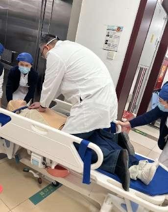 王侃老师迅速评估“患者”的病情,并开始进行心肺复苏。同时,徐林林紧急拨打电话请求支援,刘小丽护士准备急救物品。吴辰曦大夫火速从一楼赶来,随后电梯门开,李雨莹推来平车,众人协助将患者平稳送往抢救室。在转移途中,吴大夫依旧持续给“患者”做心外按压。到达抢救室后,医护分工合作,有序地进行按压、除颤、吸氧和给药等操作,在医护的共同努力下,“患者”的病情逐渐稳定下来,转危为安。