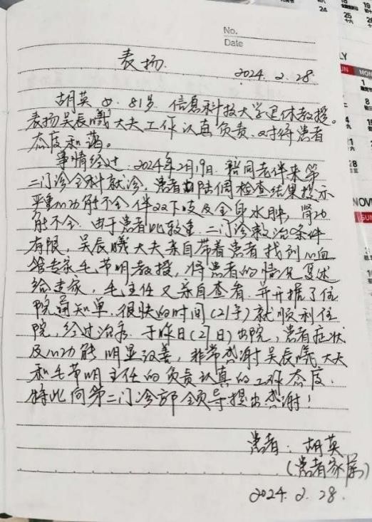 2024年2月28日,二门诊收到了一封表扬信,信中首先感谢二门诊的领导,并特别感谢毛节明教授和吴辰曦大夫,感谢他们对待患者的态度和蔼可亲,对待工作认真负责,字里行间透露着情真意切。读完这封表扬信 让科室全体员工深受感动,毛节明教授这么多年以来风雨无阻,坚持每周一都来二门诊出诊,为周围居民提供了最大便利的就医条件,他用高超的技术和崇高的医德,帮助了无数个病人,他对待病人,永远是那么和蔼可亲,我们尊称毛节明教授为毛爷爷,每次进入毛爷爷的诊室,都有一种安详平和、如沐春风的感觉。