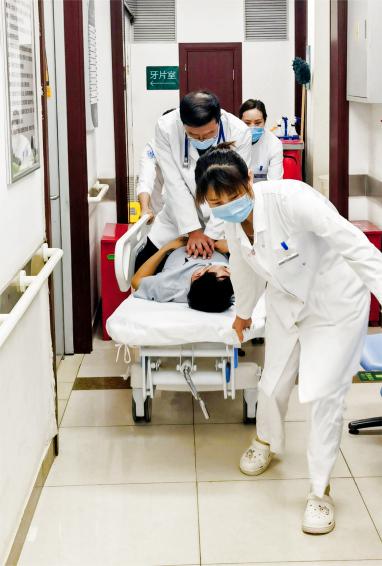全科护士推平车也及时到达事发地点,大家齐心协力将患者抬到平车上,快速的转运到一楼抢救室。开放静脉通路、给药、监护、除颤、按压都在有条不紊的进行.....整个过程中,大家分工明确、配合默契,确保患者得到全方位的救治。
