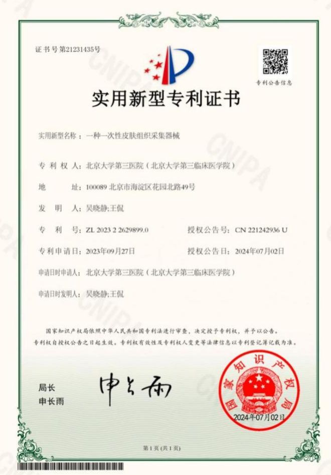 2024年7月8日,吴晓静和王侃共同研发的“一种一次性皮肤组织采集器械”新型实用专利,在经过一番紧张而有序的申报流程后,终于喜获批准。