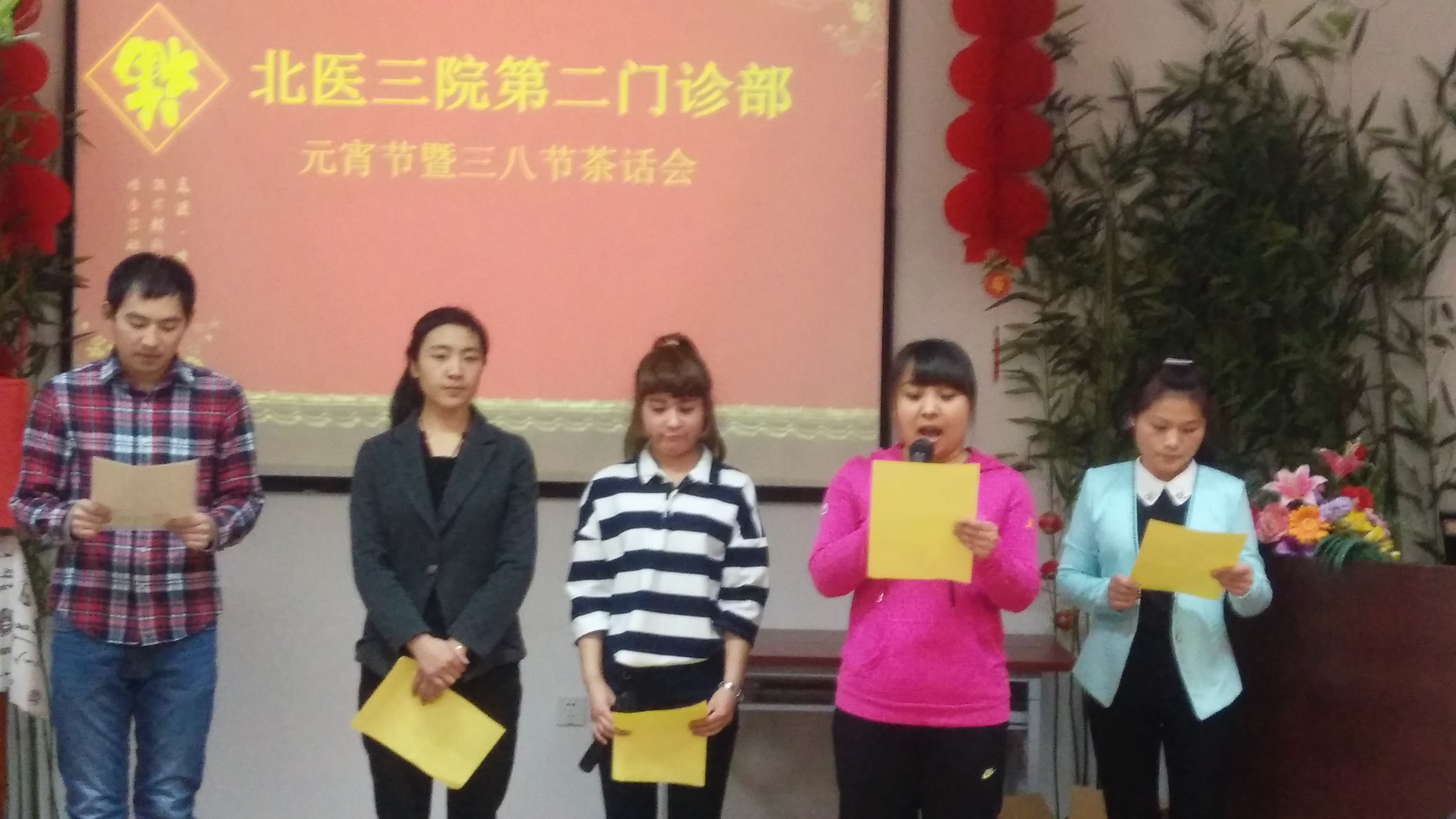 2015年3月6日下午4点半到5点半,在第二门诊部南区三楼会议室全体员工参加3月6日庆元宵节和三八节联谊会。本次活动由第二门诊部党支部负责、工会和团支部具体实施,活动内容节目主要以团队游戏猜灯谜为主线,穿插3个表演节目,主持人为科室文艺青年林飞尧和康艳。