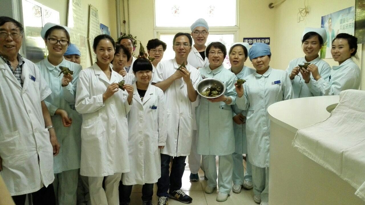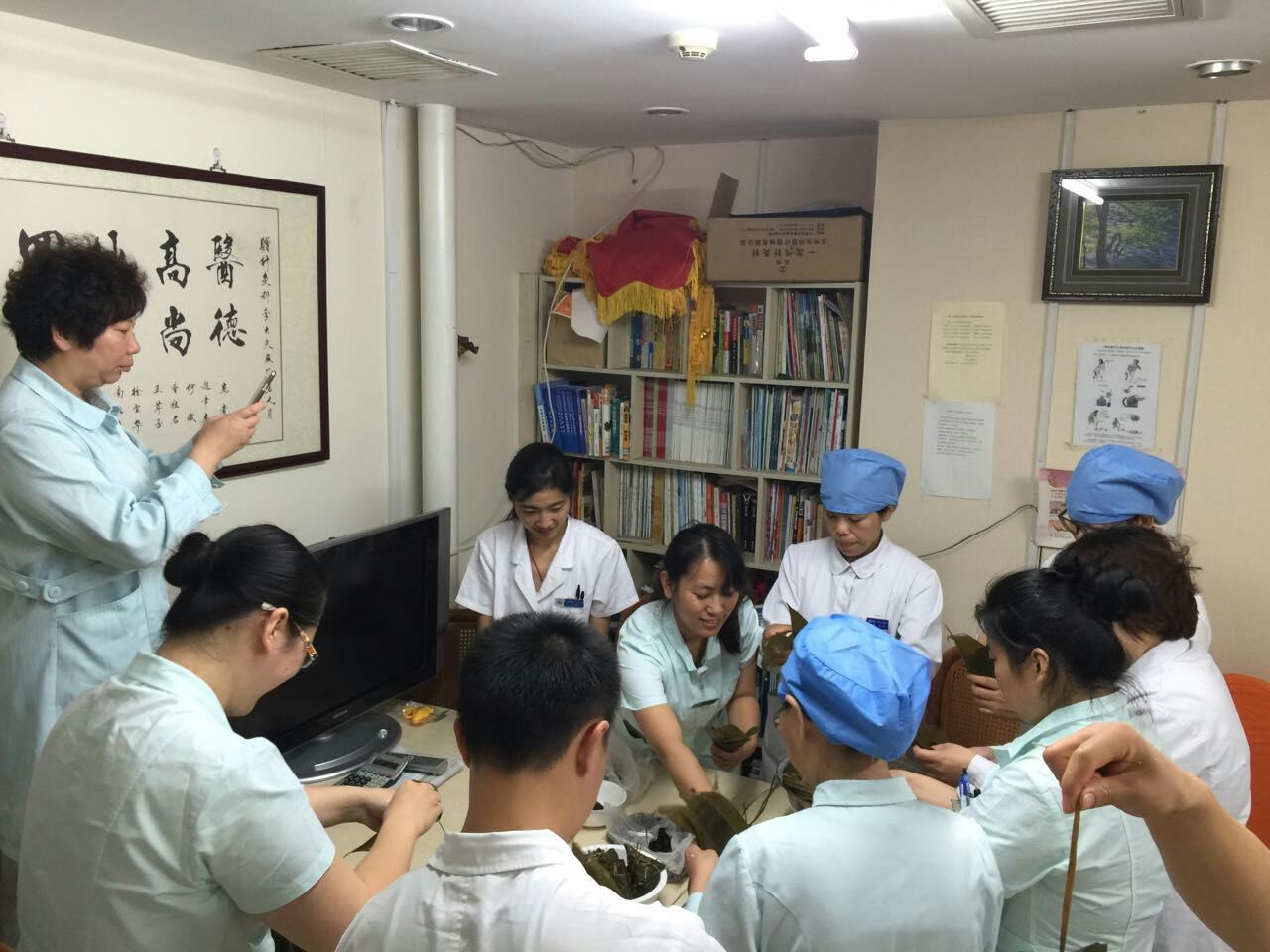015年6月19日中午12点到 13点,在南北两个医疗区,不同的楼层,工会小组预先为大家提供了江米和粽叶,热心的同事们从家中带来不同的馅心,大家象家人一样,围坐在一起,互相传授技艺,将散落的洁白米粒和馅心叠加在一起,用绿色的芦苇叶紧紧包裹在一起,三角形或圆锥形、大或小、结实的或露馅的,有胖胖的,也有瘪瘪的。虽没有外面购买的规则统一,煮起来一样的清香。大家纷纷用手机拍下自己的作品,合影留念,一起分享粽子熟了之后的甜蜜。和谐的劳动,甜美的生活,让传统的时刻变得温暖和美好。