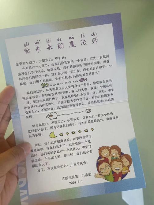 同时,我们也为二门诊工作人员的孩子们准备了一份特别的礼物。工会高峰老师精心制作了一批小卡片,每张卡片上都写满了对孩子们的祝福和鼓励。这些卡片不仅让孩子们感受到了来自大家庭的关爱,也让他们更加了解父母的工作和付出。