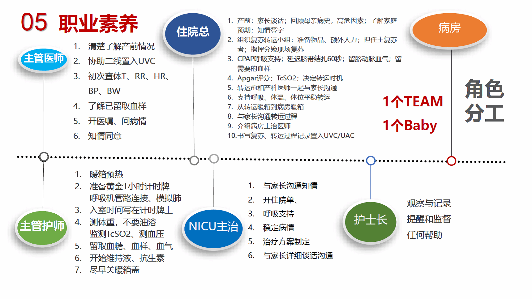 在新生儿出生时的黄金1分钟、转运回病房以及在病房内开始治疗的黄金1小时内,每个人都有不同的角色任务,每个角色分工各司其职,岗位胜任力达到最佳匹配度,以保证危重新生儿的最佳利益。