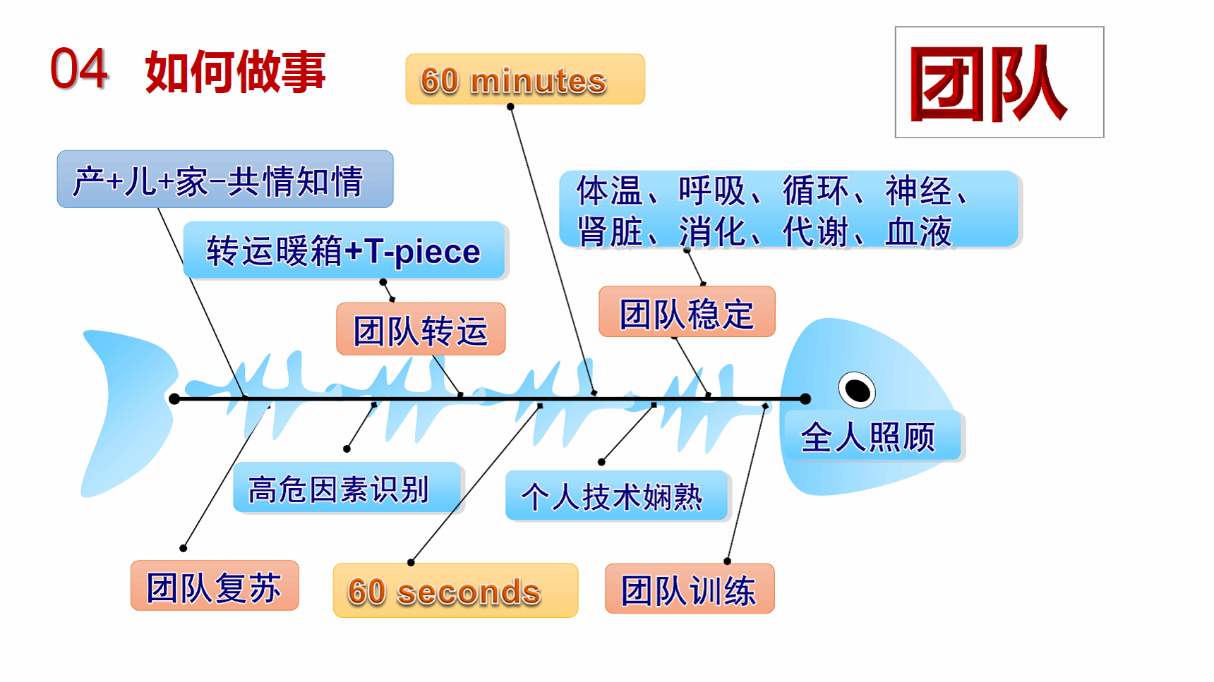 在新生儿复苏个人技术娴熟的基础上,进行团队训练,以利于在疑难病例时,整个新生儿复苏团队有效配合,并在维持体温、呼吸的状态下将出生时经过复苏的新生儿安全转运到病房,以全人照顾为理念进行个体化治疗。需要新生儿复苏团队、转运团队以及新生儿重症监护病房团队之间的协作配合,以利于危重新生儿在黄金1分钟和黄金1小时得到最佳治疗