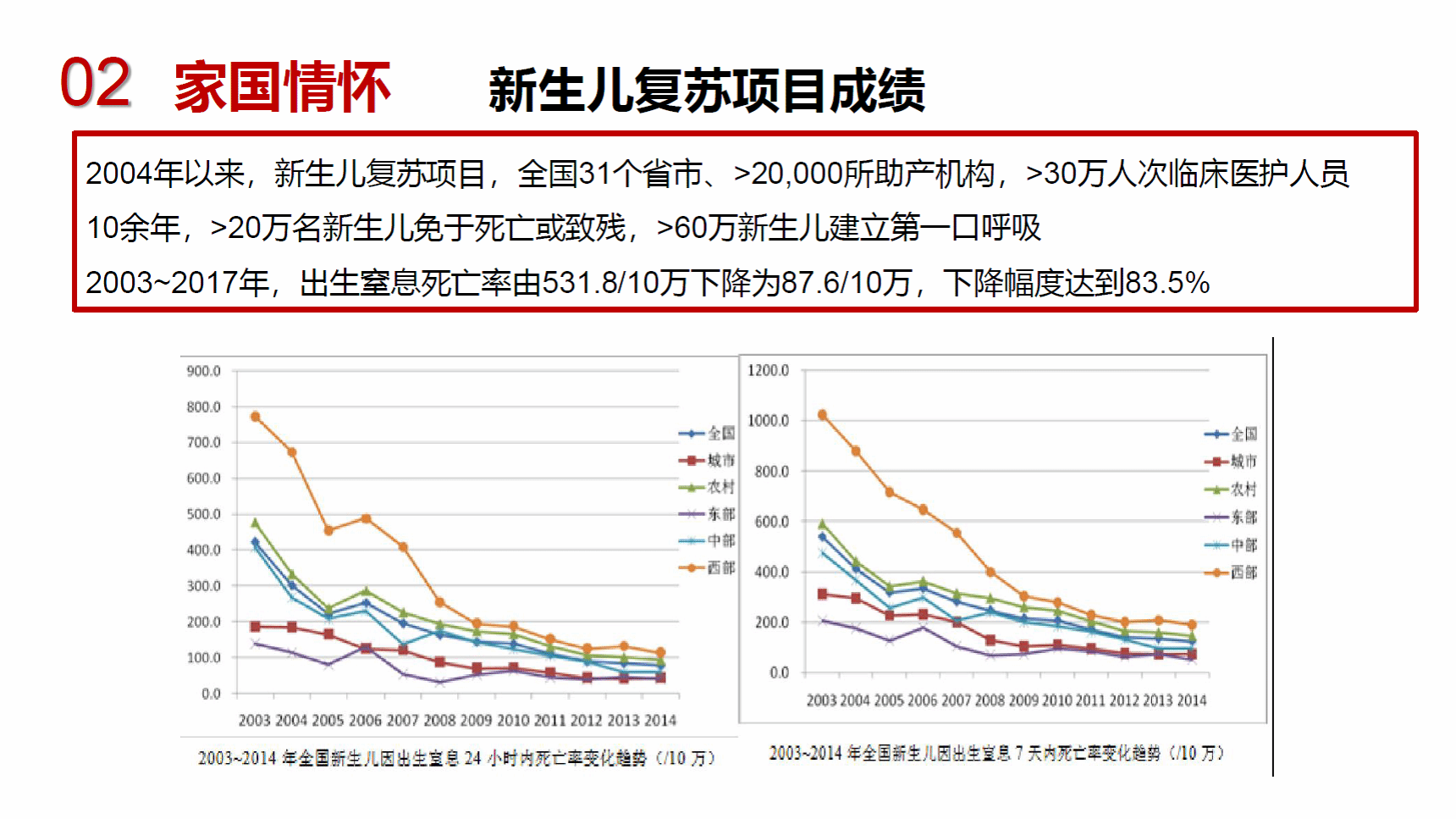 自从2004年以来,我国成立新生儿复苏项目,在叶鸿瑁教授带领下的一批围产领域专家,在2万余助产机构,培训了30万余助产士、产科医师、儿科医师,使得分娩现场的新生儿死亡率下降83.5%