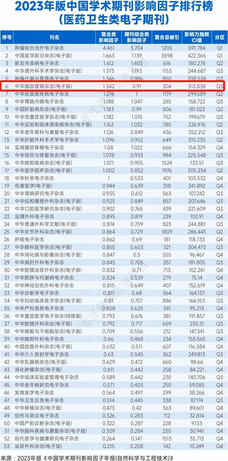 Chinese Journal of Cerebrovascular Diseases (Electronic Edition) Selected for the 2023 Edition of the Chinese Academic Journal Impact Factor Ranking List