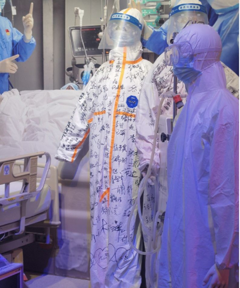 党史展览馆中还可以看到大量珍贵文物,如马克思《布鲁塞尔笔记》第四笔记本手稿、陈望道翻译的中文版《共产党宣言》、陈独秀创办的《新青年》、革命根据地的创建展板、开国大典影像、抗美援朝战争中使用过的武器、《解放思想,实事求是,团结一致向前看》讲话提纲等珍贵史料;还有一批逼真的复原景观,比如一大会址、遵义会议、瓦窑堡会议复原场景,以及白雪皑皑的东北抗日游击战实景……。此外我们还看到了火神山、雷神山医院模型,援鄂医疗员的队旗及医院抗疫场景,特别是看到圣洁白色的隔离服上有乔杰、沈宁院长等北医三院众位援鄂医疗队员的亲笔签名时,大家感慨万千,在向优秀的援鄂医疗队员们致敬的同时,也感受到作为医务工作者的自豪与使命。
