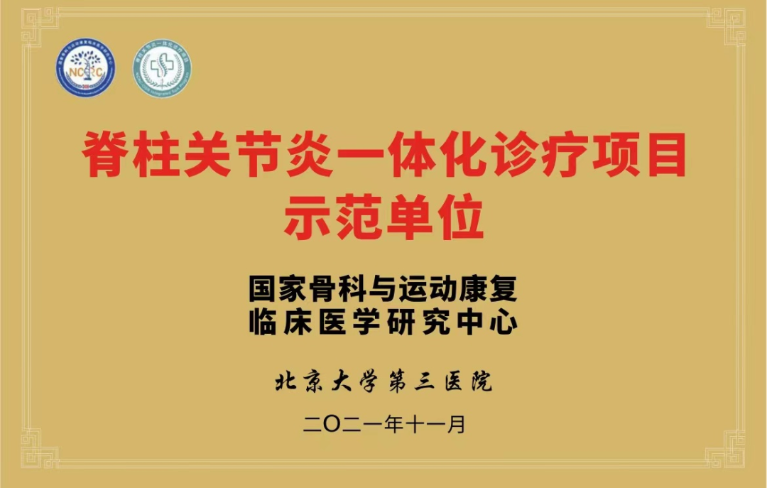 北京大学第三医院风湿免疫科荣获“脊柱关节炎一体化诊疗项目示范单位”称号。