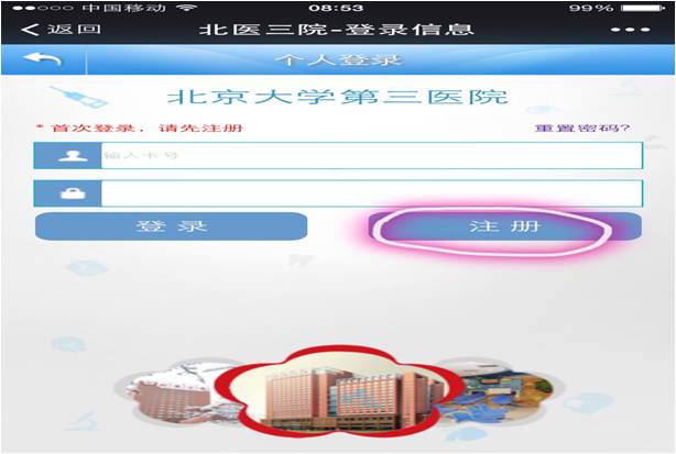 3点击注册,进入下一界面。依次填写规定信息。所填信息必须是办理就诊卡时的关联信息。