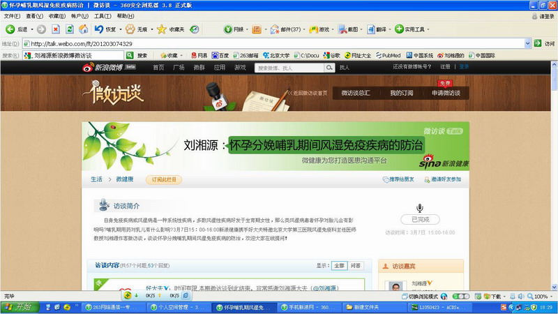3月7日15:00-16:00新浪健康携手好大夫特邀北京大学第三医院风湿免疫科主任医师教授刘湘源作客微访谈,谈谈怀孕分娩哺乳期间风湿免疫疾病的防治。详情可登陆http://talk.weibo.com/ft/201203074329