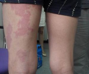 查体:一般情况良好,身高1.75米,体重56公斤,血压正常,左下肢有大量成片充血性红斑,压之褪色,不高出皮面。阴茎较粗大,尿道口及龟头有发红,四肢关节肌肉无异常,心肺肝脾无异常。四肢静脉血管触之有发硬条索感,尤其是左下肢静脉明显曲张,无压痛。