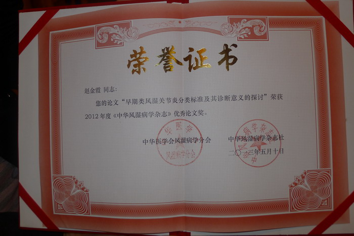 祝贺我科赵金霞博士获得2012年中华风湿病学杂志优秀论文奖
