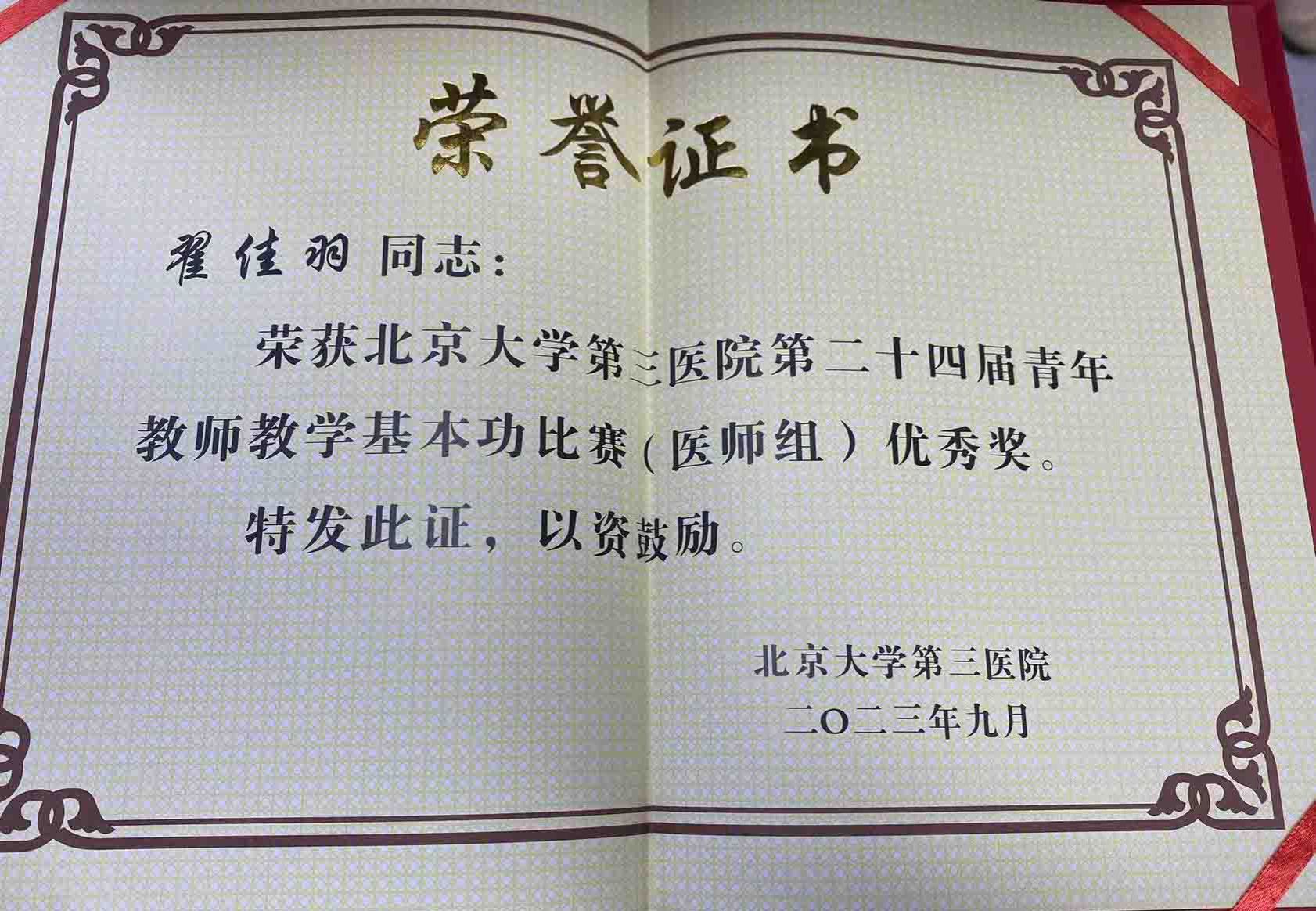 祝贺我科翟佳羽同志荣获北医三院第二十四届青年教师教学基本功比赛(医师组)优秀奖