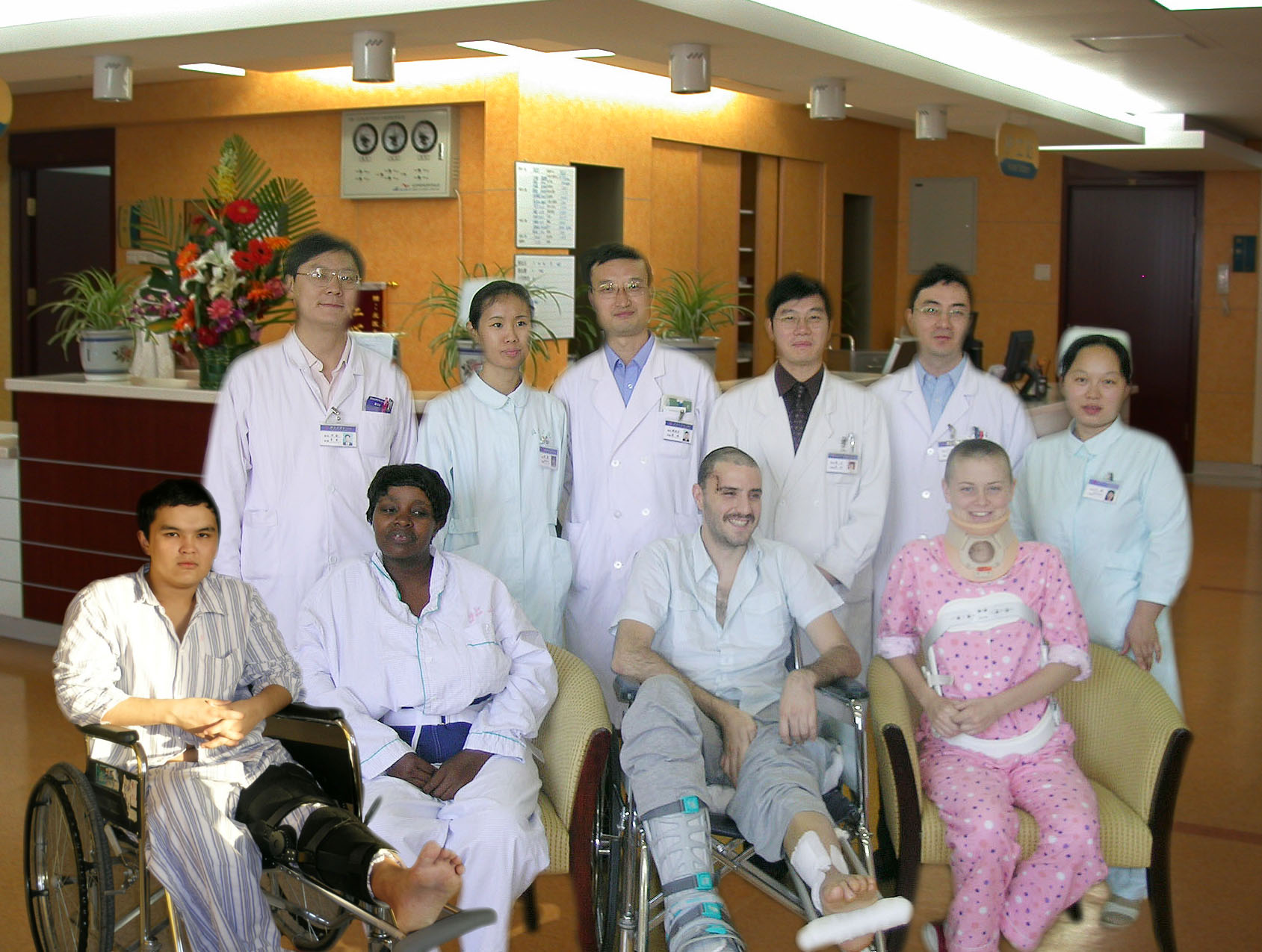 四位外籍患者分别来自英、美、哈萨克斯坦和布隆迪。有三位因为车祸导致骨折,都在第一时间得到了治疗。其中一位美国病人颈椎、腰椎均有严重骨折,来院时四肢瘫痪不能活动。因为病情严重,周方主任及张志山医生等在中秋节连夜为病人进行了长达7个小时的手术。术后病人四肢不但恢复了感觉和运动,而且经过一周的康复训练后已经能独立行走。另外一位是腰间盘突出患者,专程从非洲慕名而来,也得到了满意治疗。他们不仅治好了困扰身体的疾病,还体会到了医护人员的认真负责、热情周到的服务。