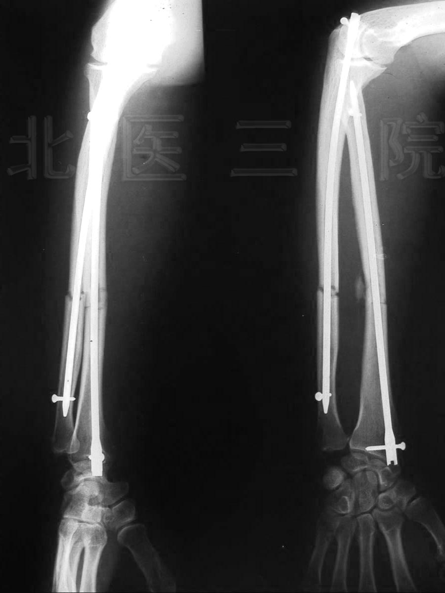 臂经多次手术,骨折处已出现严重的骨缺损和骨萎缩,必须重新植入新骨并牢固固定。院