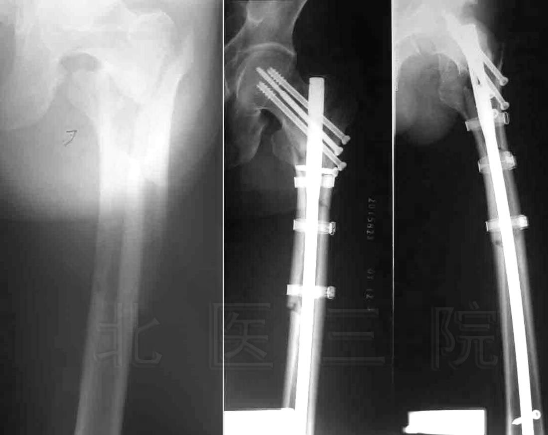 图为:85岁,股骨粗隆部粉碎骨折,微创置入LISS,术后 3个月骨折愈合