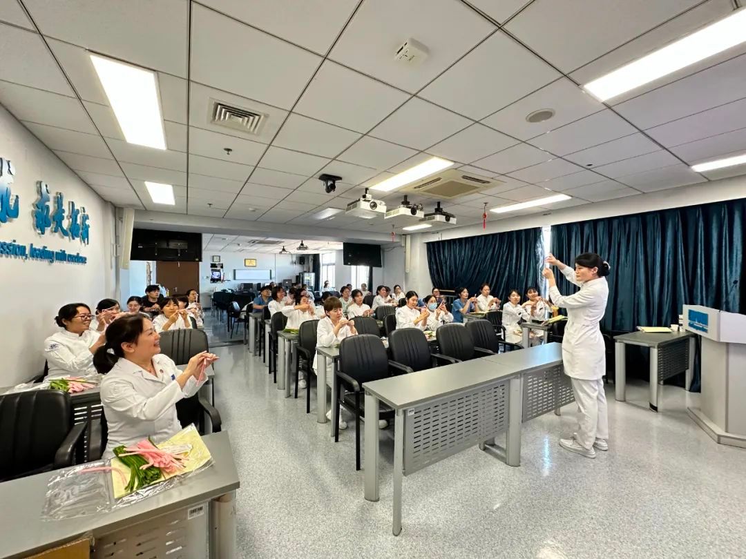 在播放视频时,护理团队代表们纷纷送上大家亲自编制的粉色郁金香花束,同时送上节日的祝福。医生们惊喜万分,接过郁金香花束,露出了幸福的笑容。