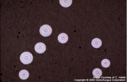 上述易感人群如出现发热、咳嗽、头痛、呕吐等肺部或中枢神经系统表现,经一般治疗无效或诊断不清者,均应警惕该病可能,尤其有养鸽史或鸽粪接触史者。确诊需靠病原学检查。最常用的莫过于墨汁染色法,可以根据感染部位不同取新鲜脑脊液、痰液等标本加墨汁染色后制片镜检找病原体。新生隐球菌感染镜下可看见圆形或椭圆形的厚壁孢子,外有一层宽阔荚膜,边缘清楚完整。若脑脊液直接制片未发现菌体,可离心沉淀后重复检查。标本也可同时做真菌培养。