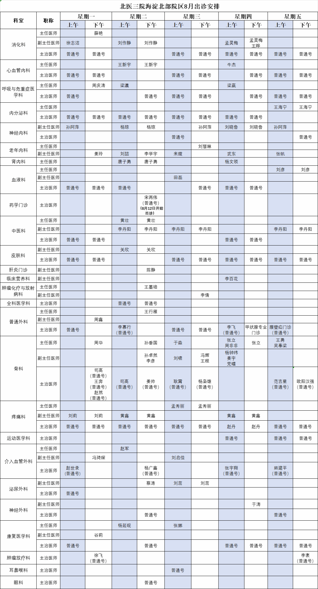 2025年8月北京大学第三医院海淀北部院区出诊安排