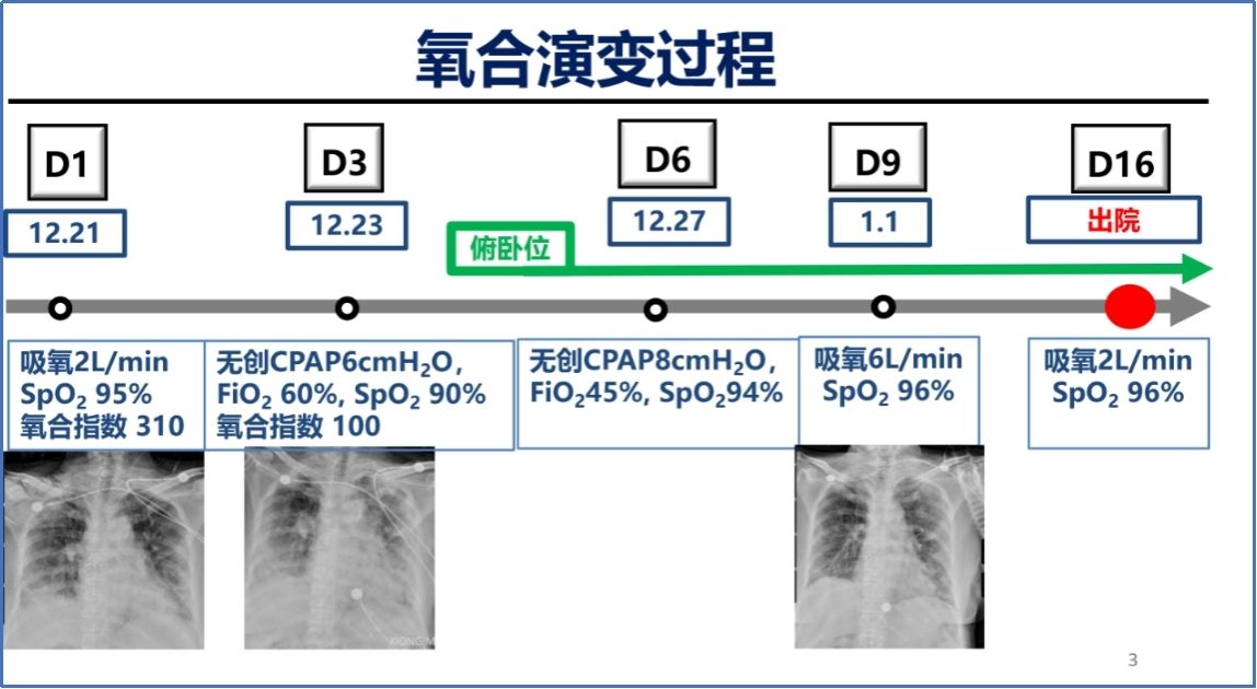 自评与感触:这是管理病房早期接管的病人,认识到患者病情进展迅速,在治疗的初期,确实只是纠结于各种药物治疗方案的调整,在氧合情况较差的时候开始重视清醒俯卧位治疗。所幸患者和家属十分配合,在理解这项治疗的意义后,在护士的帮助下积极地执行这项治疗,在我们共同努力下,一位很有可能继续病情恶化,有生命危险的患者逐渐恢复并出院返家了,十分令人欣慰。