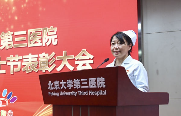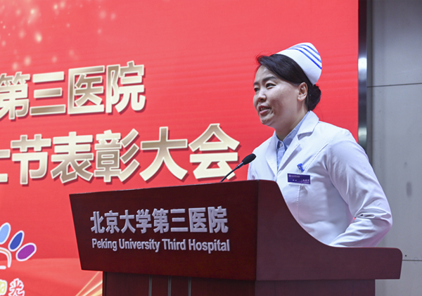 北京大学医学部优秀护士长代表、运动医学科刘研护士长讲述了自己在三院护理工作中的收获和感激之情,分享了自己在援藏抗疫期间担任护理队长和紧急筹备亚重症病房的宝贵经历。她表示,未来将继续为三院的护理事业添砖加瓦,快乐工作,用有爱的双手,谱写三院的天使之歌。