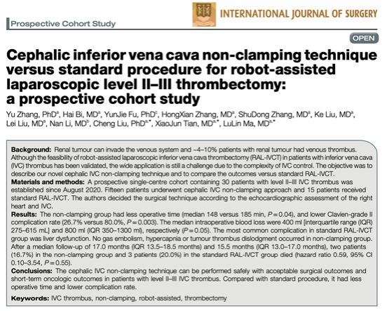 2023年5月,北京大学第三医院泌尿外科马潞林教授团队在International Journal of Surgery发表题为《机器人辅助下腔静脉近心端不阻断技术处理II-III级癌栓的单中心前瞻性队列研究》(Cephalic inferior vena cava non-clamping technique versus standard procedure for robot-assisted laparoscopic level II–III thrombectomy: a prospective cohort study)的论文。