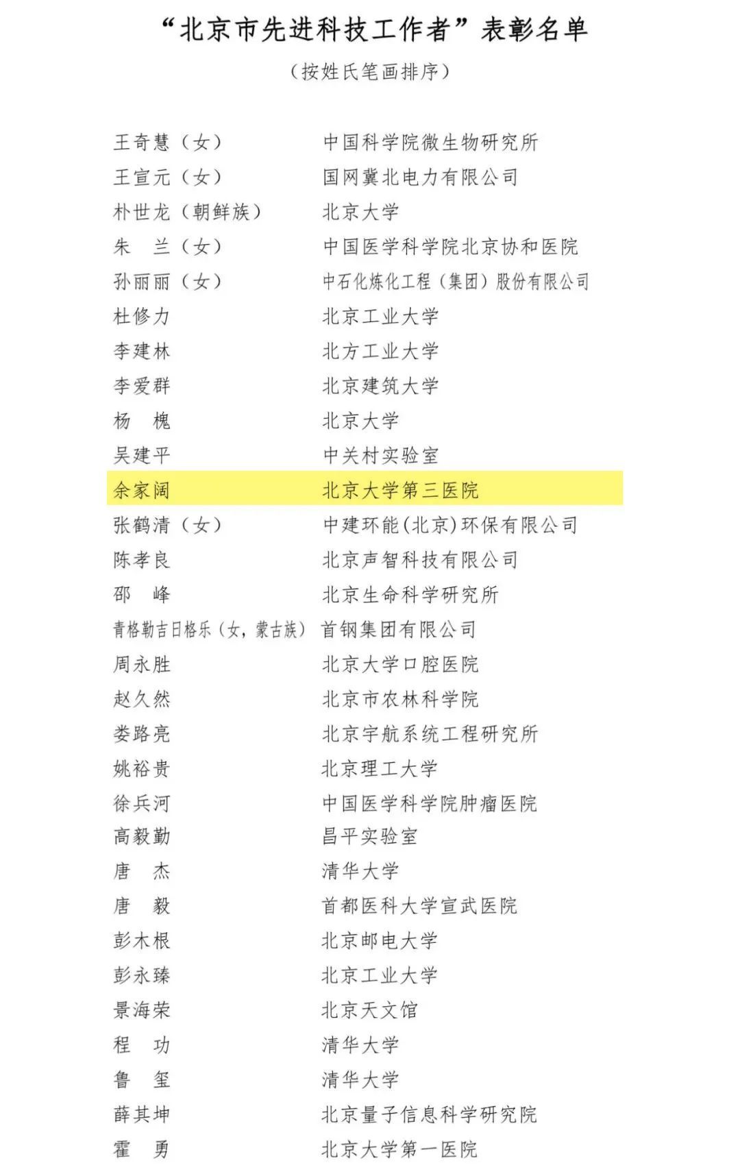2023年7月27日,北京市科学技术协会、北京市人力资源和社会保障局公布首届“北京市先进科技工作者”称号获得者名单,30人荣获该荣誉称号,北医三院运动医学科余家阔教授名列其中。