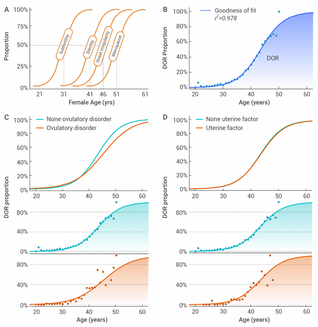 北医三院生殖医学科团队利用中心大数据建立了一个卵巢衰老曲线模型,根据当前卵巢储备评分和卵巢衰老曲线可预测未来DOR开始的年龄和围绝经期开始的年龄。研究表明,卵巢衰老遵循生长曲线模型。“Fixed interval”假说提出,不同生育里程碑事件之间的时间跨度在一般人群中是固定的,如生育力轻度下降(31岁)、DOR(41岁)、月经不规律(46岁)和绝经(51岁)等(图1A)。基于以上研究背景和假说,本团队利用北医三院生殖中心的大数据资源建立了一个描述卵巢衰老的生长曲线模型(图1B),并根据是否存在排卵障碍(图1C)或子宫相关因素(图1D)进一步细化该模型,结合卵巢储备状况,开发了兼顾标准化和个体化的卵巢储备评估和预测工具,有助于育龄期女性根据自身情况合理安排生育计划。