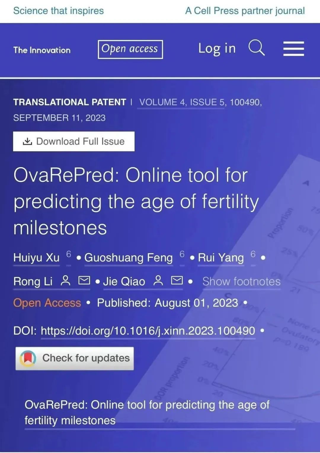 近日,北京大学第三医院乔杰院士、李蓉教授团队在The Innovation发表题为《OvaRePred:一种预测女性生育力里程碑事件发生年龄的在线工具》(OvaRePred: Online tool for predicting the age of fertility milestones)的研究成果,利用大数据资源在国际上首次建立了卵巢衰老曲线,并整合团队一系列评估卵巢储备的算法,研发了兼顾标准化和个体化的卵巢储备评估和预测工具——OvaRePred,助力育龄期女性合理安排自己的生育计划。