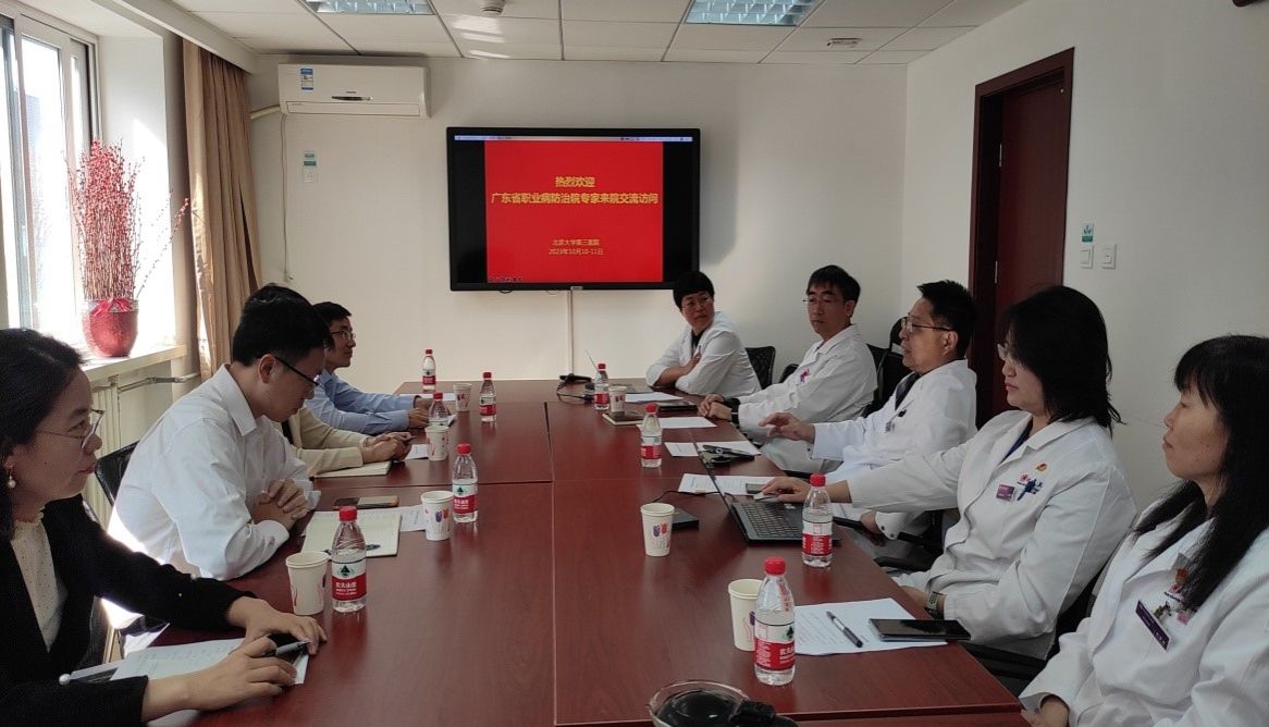 2023年10月11日上午,广东省职业病防治院党委书记郑子谦一行四人来访我院。我院党委副书记、中毒救治中心主任李树强出席,职业病科、中毒救治中心、康复医学科相关领导和工作人员参加了交流。会议由医务处处长胥雪冬主持。