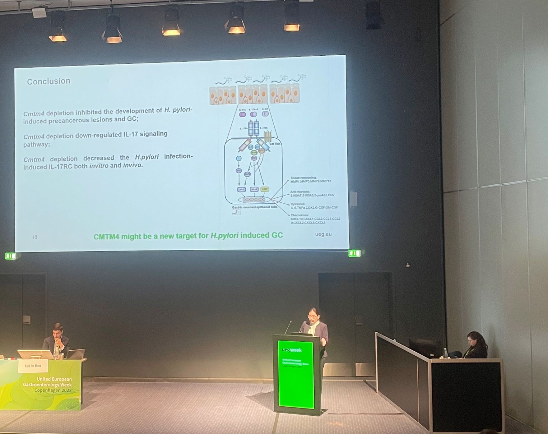 会议期间,我院消化科助理研究员付伟伟进行了题为“CMTM4在幽门螺杆菌致胃癌过程中的功能”的大会发言,该研究对免疫调节分子CMTM4在幽门螺杆菌致胃癌过程中的功能机制进行了探讨,为阻断幽门螺杆菌诱导的炎癌转变过程提供了线索,并提出CMTM4可能作为幽门螺杆菌感染所致胃黏膜疾病及胃癌的潜在治疗靶点。