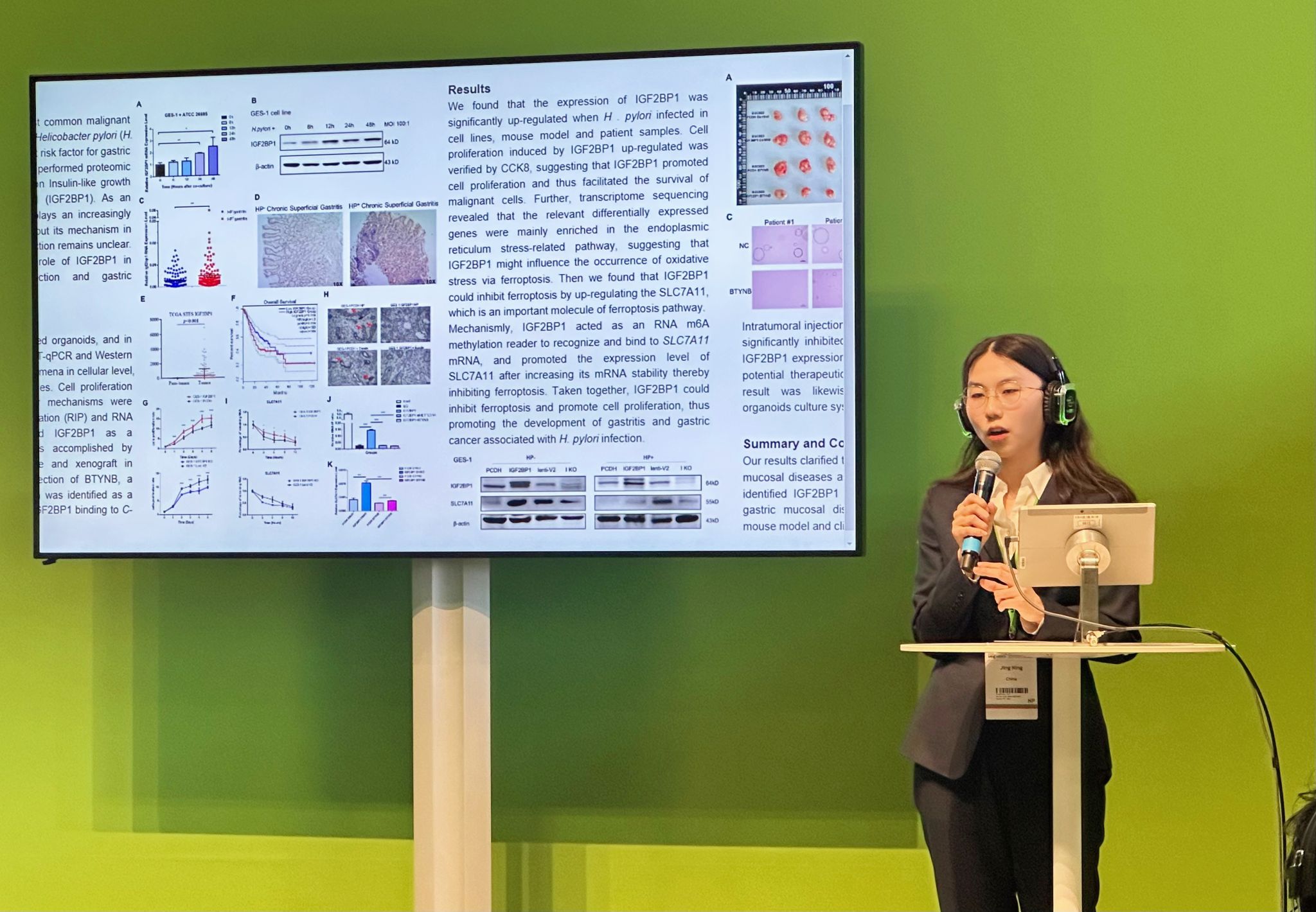 博士后宁静在壁报展示环节发言并获得最佳摘要演讲奖,其关于“幽门螺杆菌感染介导IGF2BP1表达上调抑制铁死亡促进胃癌的发生发展”的研究,发现幽门螺杆菌可通过影响宿主蛋白IGF2BP1的表达,抑制铁死亡的发生,促进细胞恶性增殖,从而促进幽门螺杆菌感染相关胃炎和胃癌的发生发展,这一研究提示IGF2BP1可能作为胃癌的潜在治疗靶点。