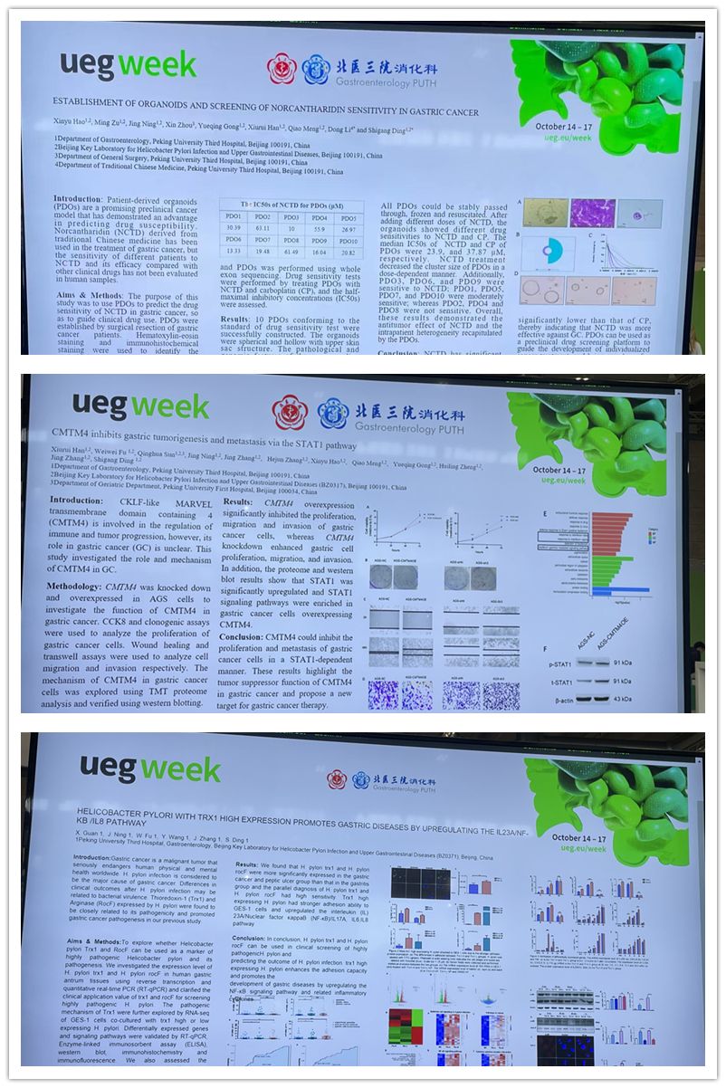 多项研究入选UEGW,充分展示了我院消化科在幽门螺杆菌致胃黏膜疾病及胃癌的机制研究、胃癌早期筛查及预测、中医药治疗胃癌等近年来研究热点方面的进展,为该领域更深入的机制及治疗方法研究奠定了良好基础。