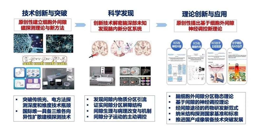 《脑细胞外间隙成像探测技术与应用》是对脑细胞外间隙未知超微结构空间进行技术探测、系统解密和开发利用的研究成果。成果由北京大学第三医院韩鸿宾教授牵头,联合中国计量院、中科院电工所、首都医科大学、温州医科大学以及医学成像装备头部企业的工程技术专家共同完成,研究工作由国家杰出青年科学基金、北京市科技计划、国家重点研发计划项目支持,历时15年。