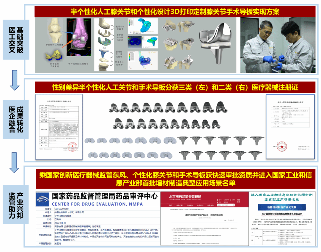 我国全膝置换很快将年超100万例,但多数临床用进口或仿制标准产品的假体匹配差、截骨面覆盖率低、常过多截骨且远期翻修率高。余家阔教授团队携华南理工大学杨永强教授团队,历时20年,基于国人膝关节影像、术中测量及下肢骨性结构三维测量,完成个性化性别差异设计膝关节假体研发并获三类医疗器械注册证;配套研发的个性化手术导板获得创新医疗器械特别审批资格并获二类医疗器械注册证,并被纳入中华人民共和国工业和信息化部首批增材制造典型应用场景名单。该成果使我国在个性化性别膝(半个性化)人工膝关节设计、制造和临床手术各领域居于国际领跑地位。