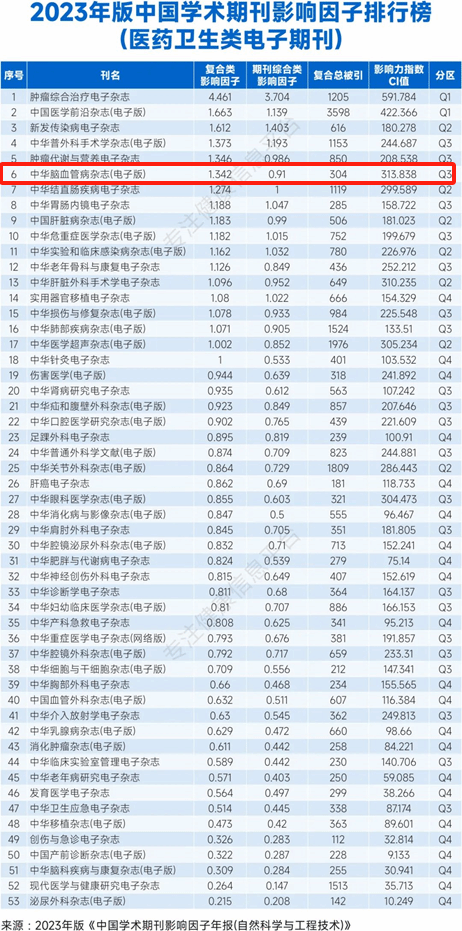 2023年11月9日,2023年版中国学术期刊影响因子排行榜(医药卫生类电子期刊)发布,由中华医学会主办、北医三院承办的《中华脑血管病杂志(电子版)》入选,并在53种同类期刊中位列第六名。