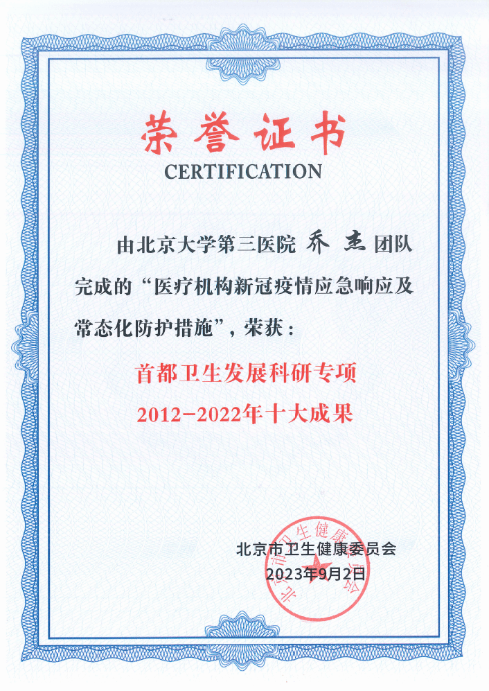 “医疗机构新冠疫情应急响应及常态化防护措施”项目荣获首都卫生发展科研专项2012-2022年十大成果