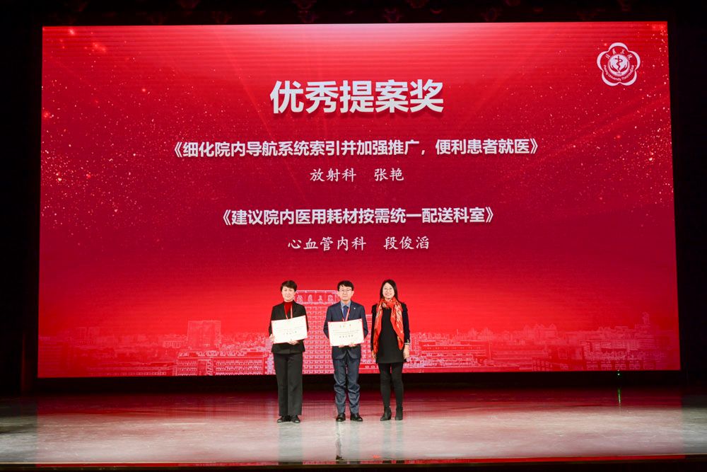 放射科张艳代表提出的《细化院内导航系统索引并加强推广,便利患者就医》、心血管内科段俊滔代表提出的《建议院内医用耗材按需统一配送科室》荣获优秀提案奖。