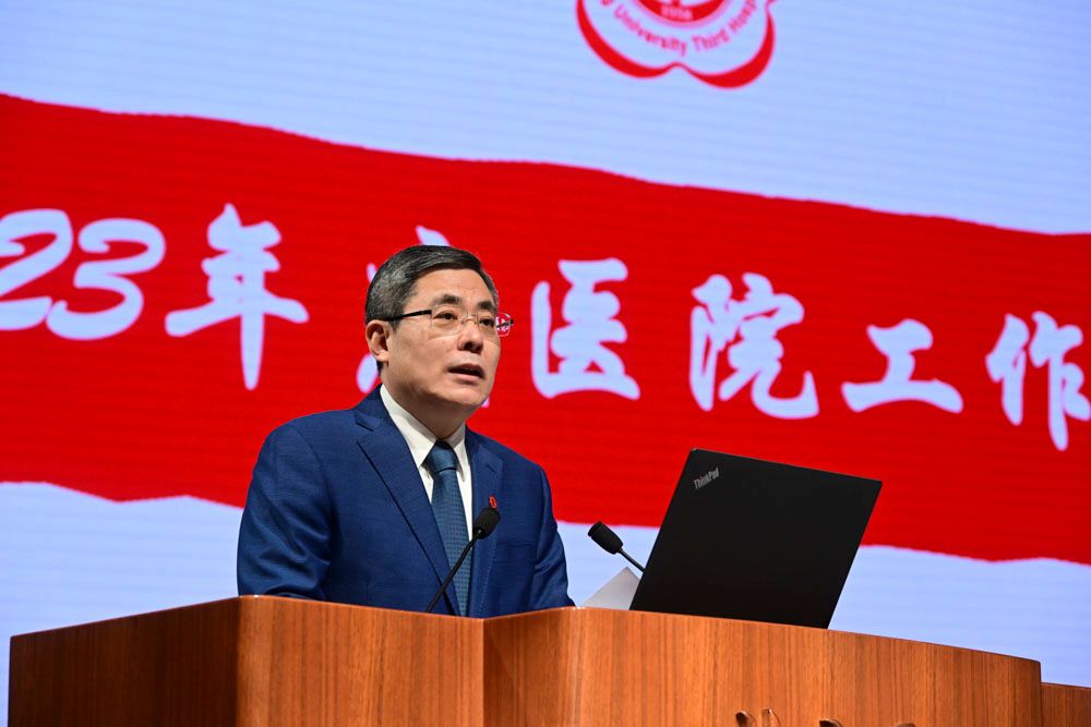 “我们唯有乘势而上,接续奋斗,方能再创辉煌。2024年,让我们共同携手,为实现医院高质量发展,建设成为世界一流大学附属医院而不懈奋斗!”
