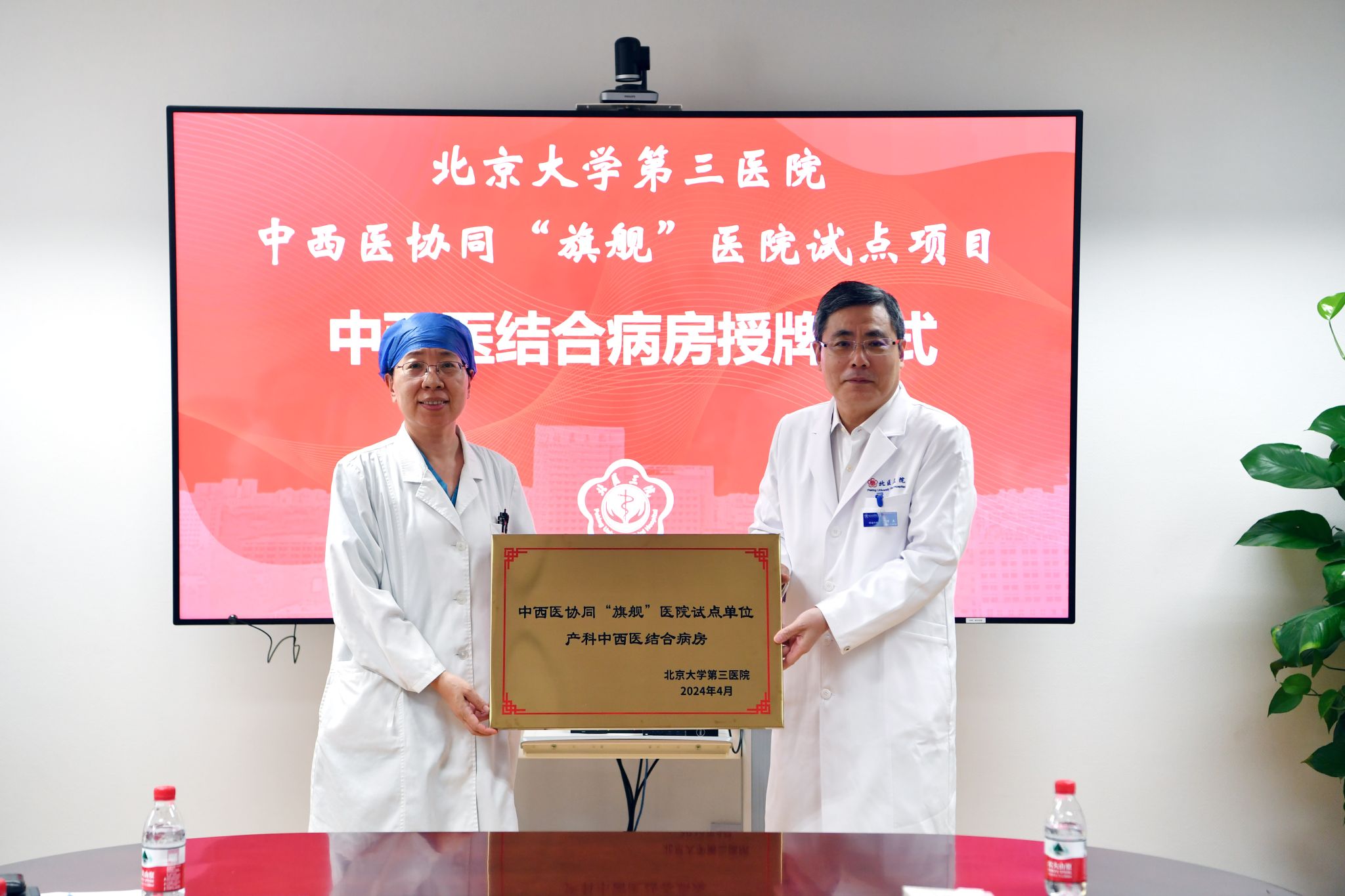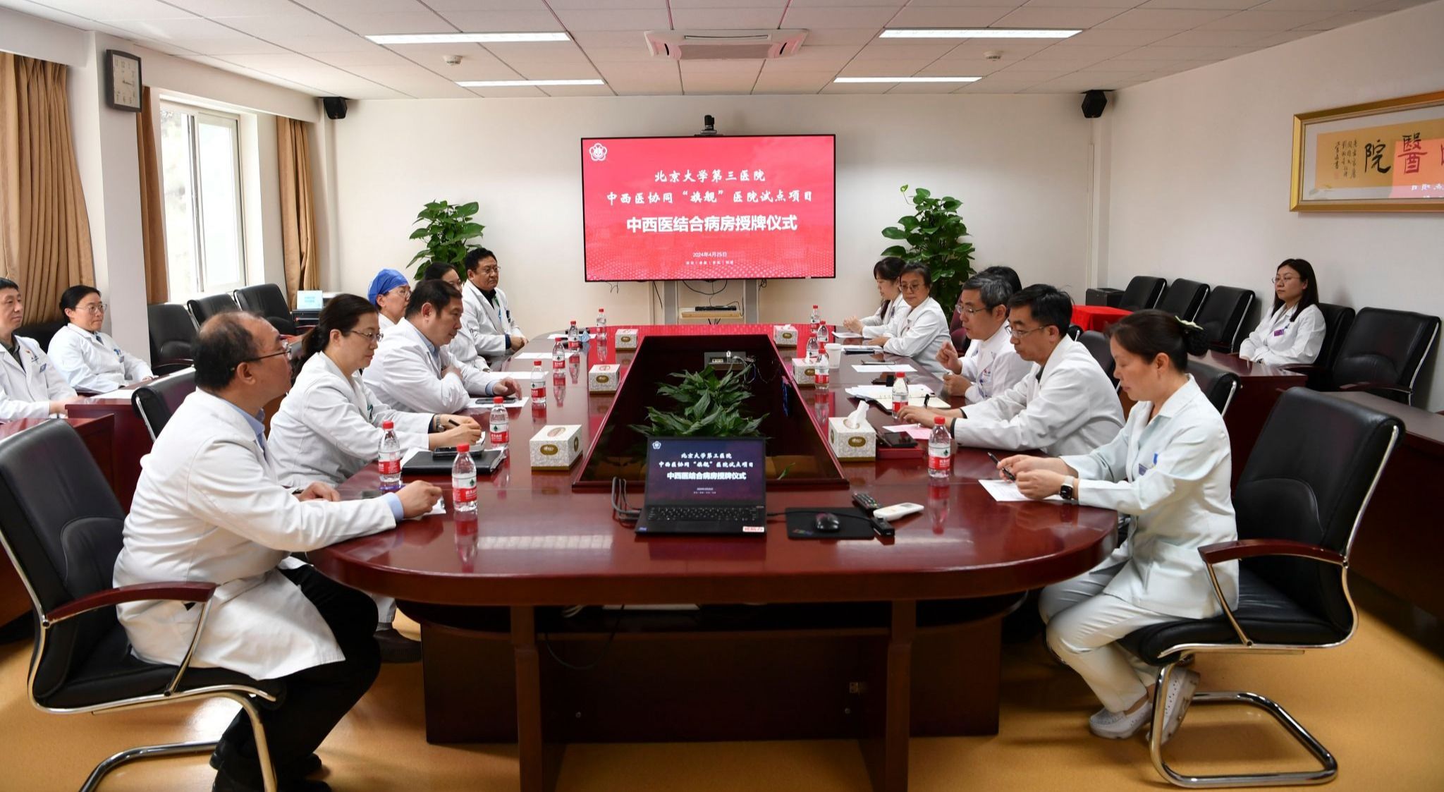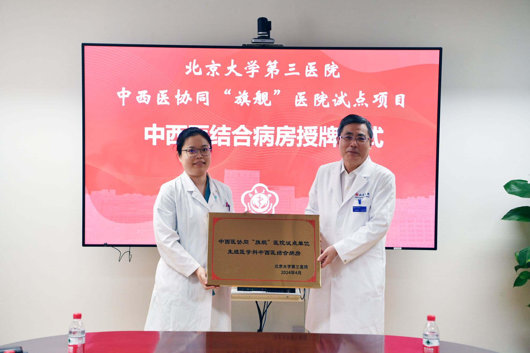 2024年4月25日下午,北京大学第三医院举行中西医结合病房授牌仪式。院长付卫、副院长李蓉,相关临床科室、职能处室负责人出席仪式。中西医结合病房的正式授牌,标志着北医三院在中西医结合领域迈出了坚实的一步,具有里程碑意义。授牌仪式由医务处处长胥雪冬主持。