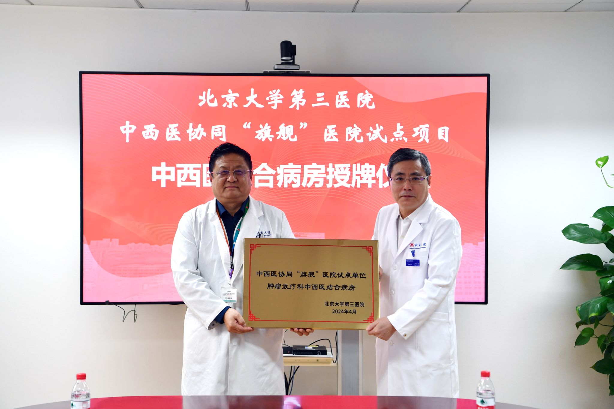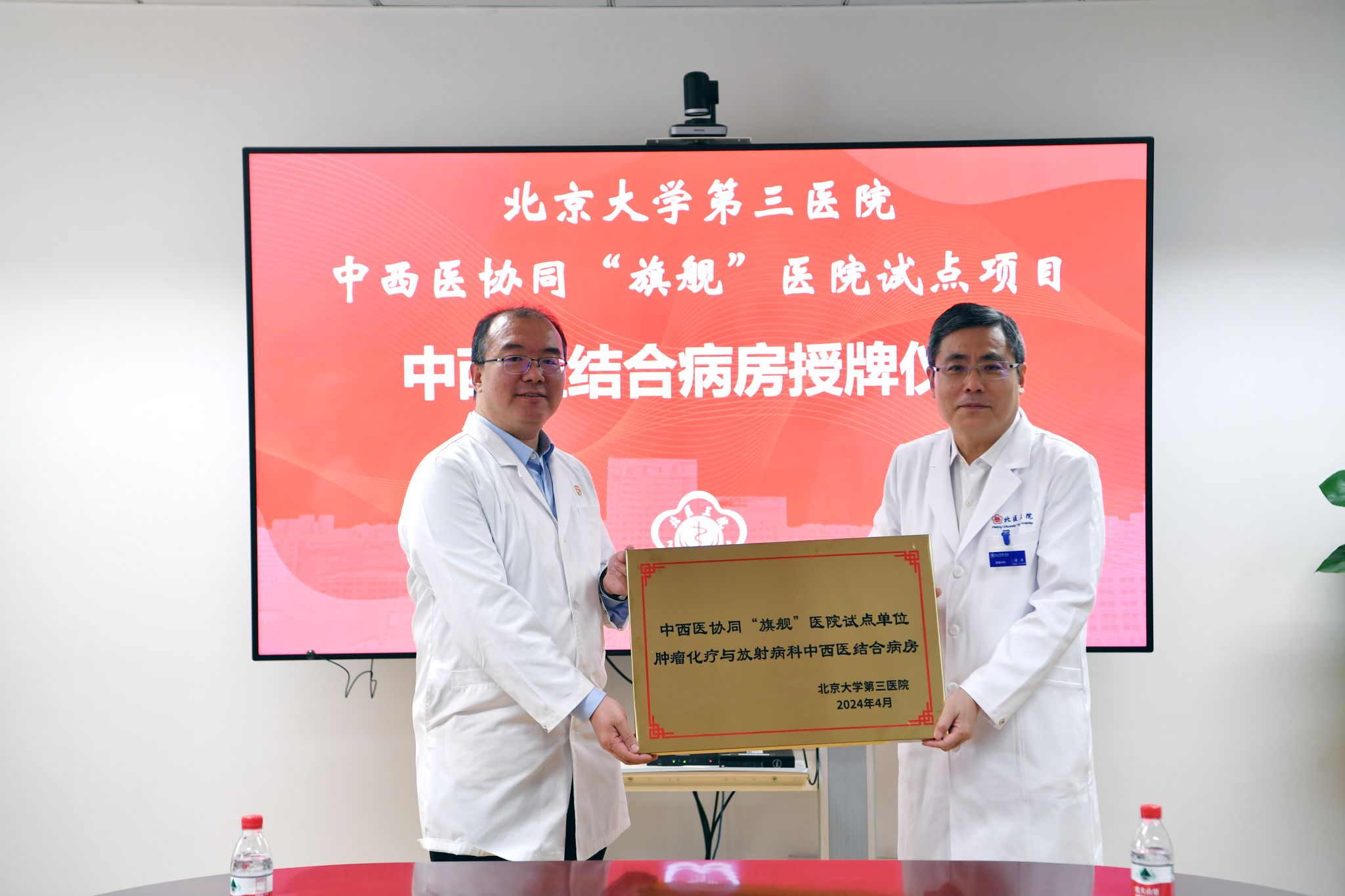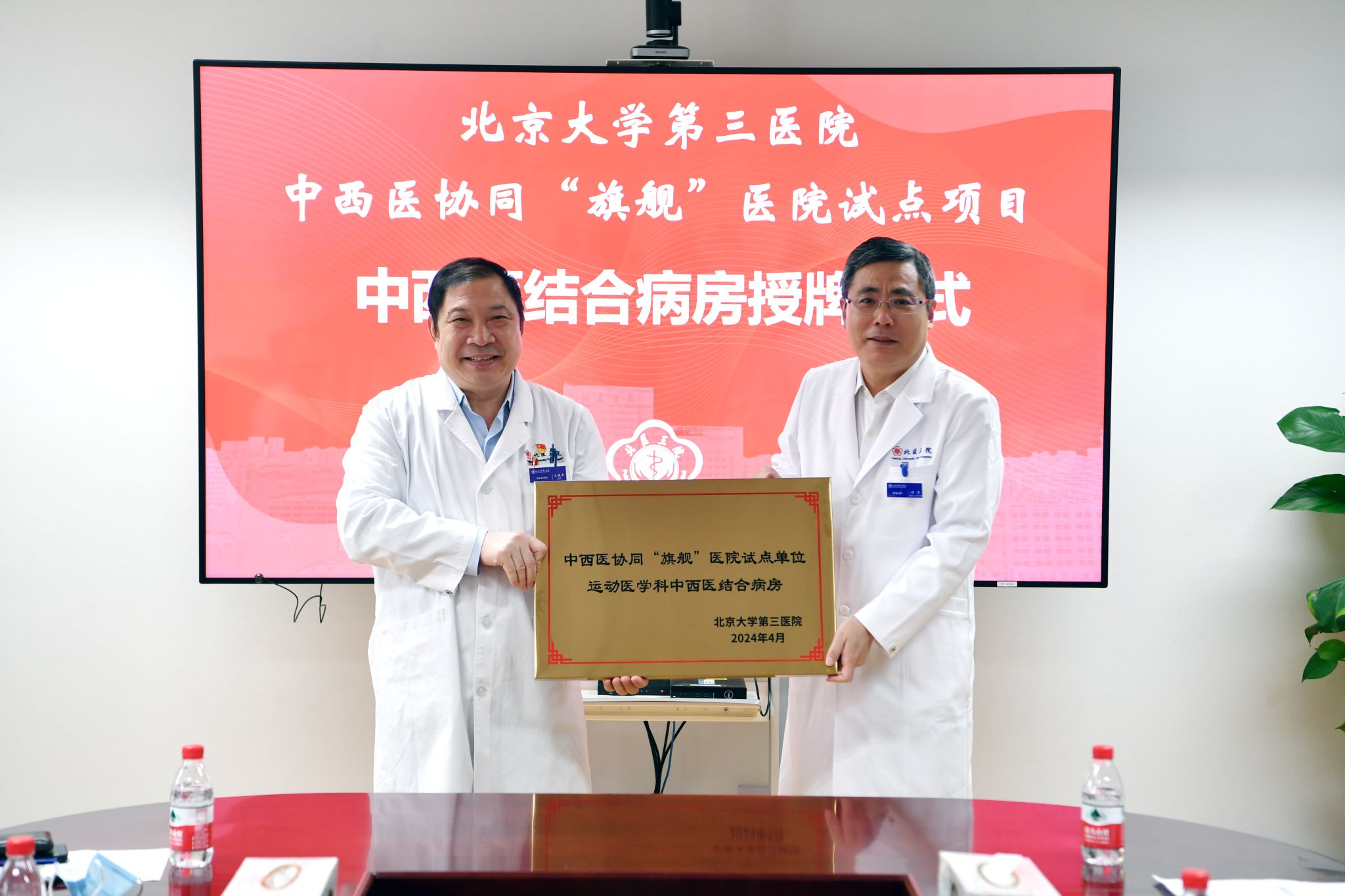 2024年4月25日下午,北京大学第三医院举行中西医结合病房授牌仪式。院长付卫、副院长李蓉,相关临床科室、职能处室负责人出席仪式。中西医结合病房的正式授牌,标志着北医三院在中西医结合领域迈出了坚实的一步,具有里程碑意义。授牌仪式由医务处处长胥雪冬主持。