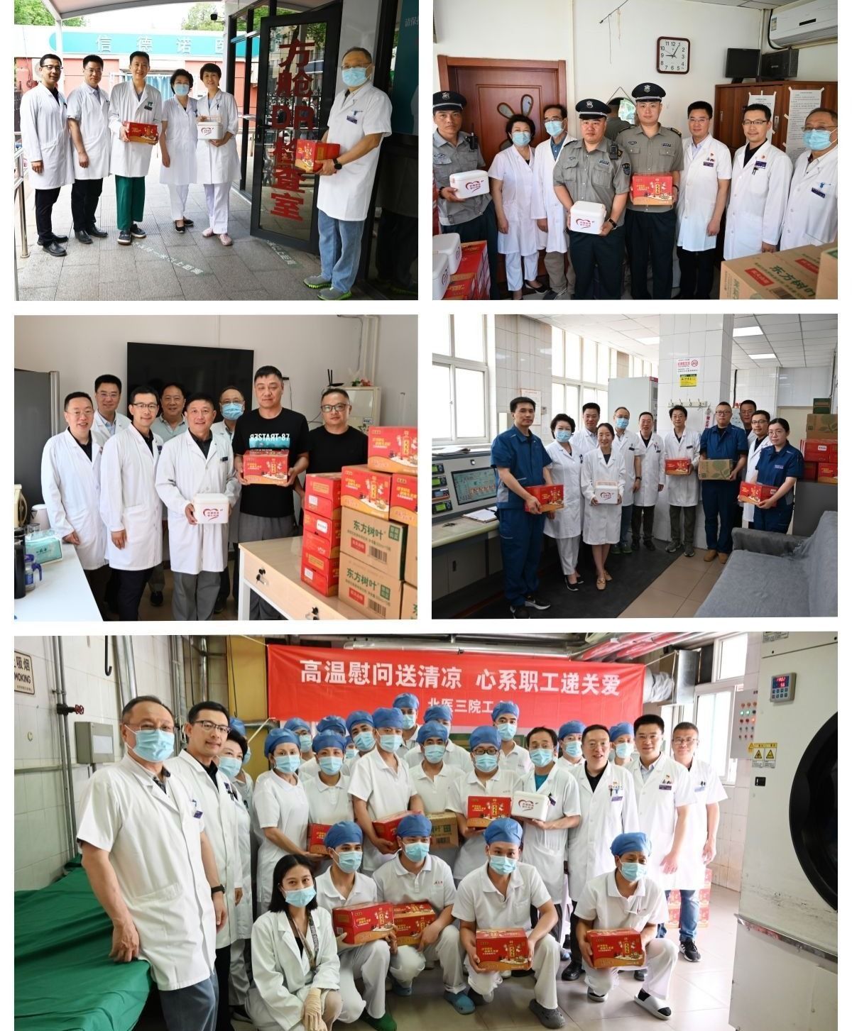 北医三院党委副书记刘东明,院工会主席赵荣生、常务副主席刘温文、副主席王军及院工会全体人员,先后来到方舱CT、治安岗亭、锅炉房、洗衣房、维修中心、营养食堂、车队等部门和岗位,看望并慰问了在高温下仍坚持奋战在一线的职工会员们,为他们送去了清凉、健康的解暑饮品和精心准备的防暑小药箱。