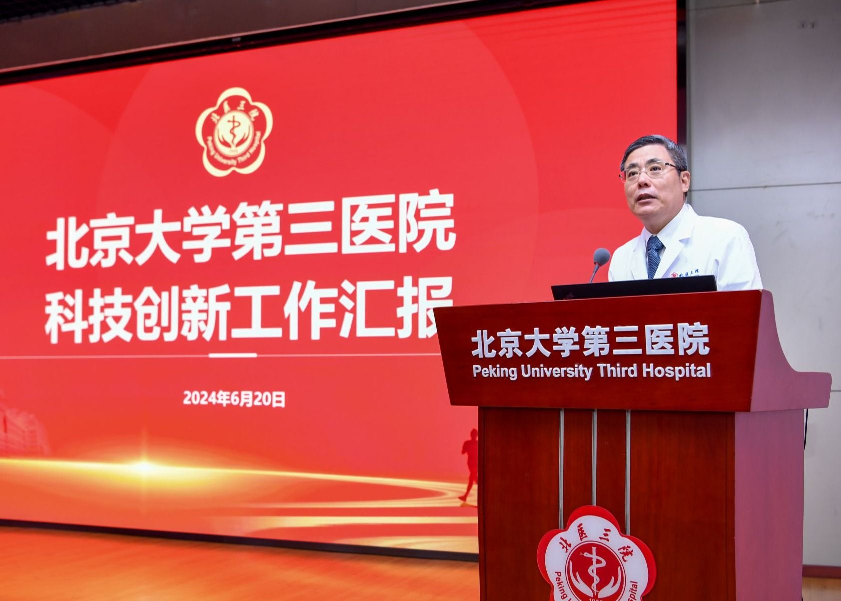北医三院院长、科协主席付卫代表北医三院科协对医院科技创新工作进行汇报。