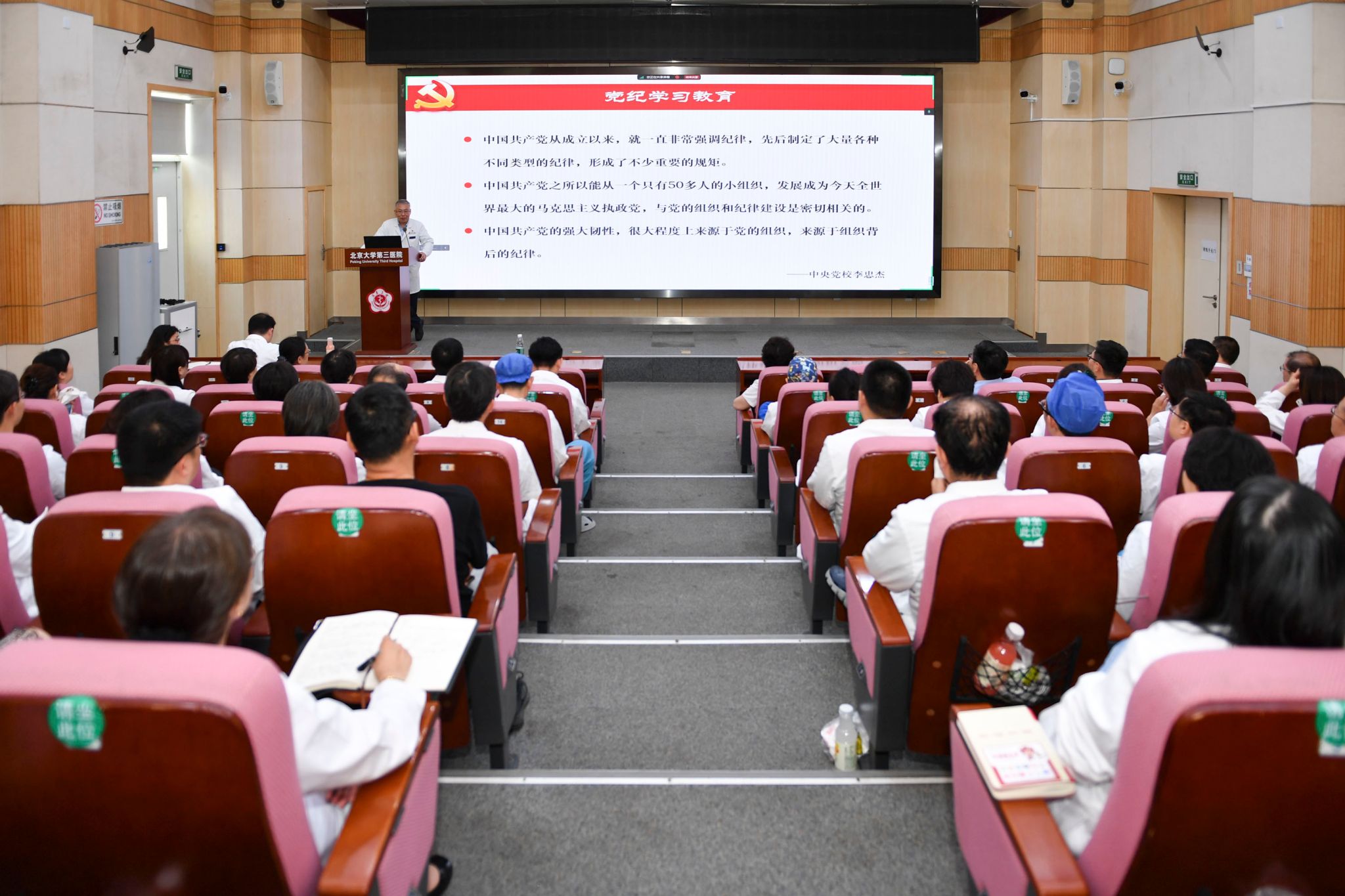 2024年7月3日中午,北京大学第三医院在健康医学中心楼会议室组织召开党纪学习教育会,党委书记金昌晓讲授专题党课。党委副书记、纪委书记杨莉及全院党总支、党支部书记参会。党委副书记刘东明主持会议。