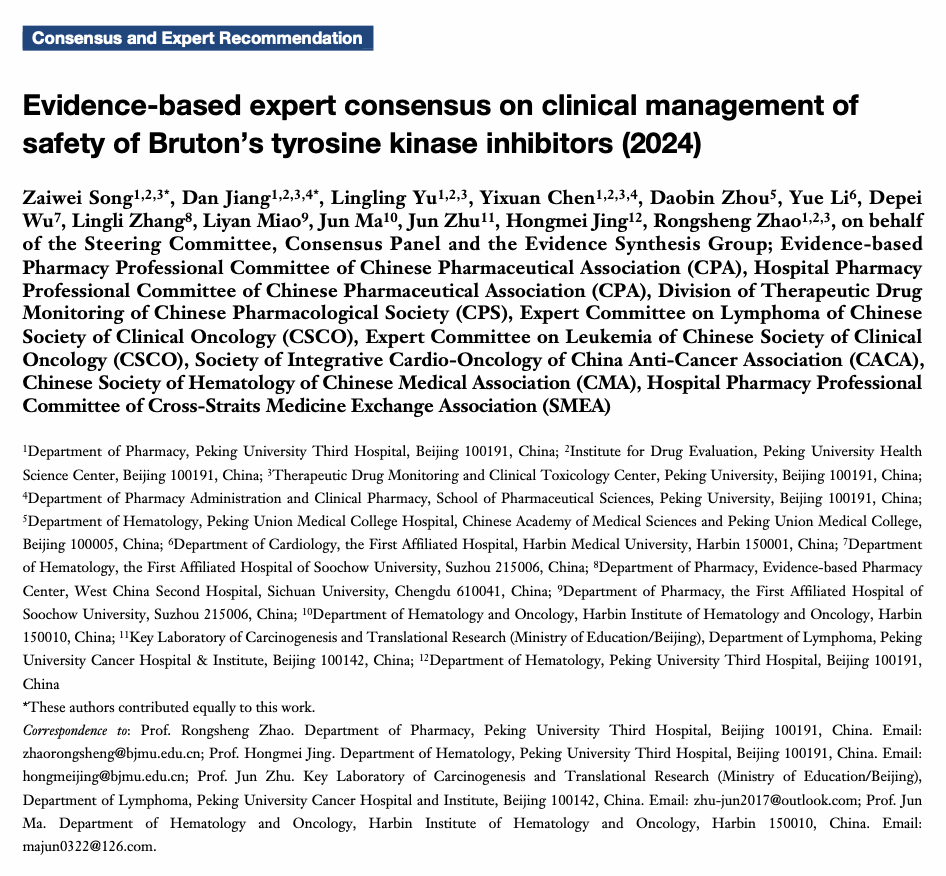近日,由北京大学第三医院药学部赵荣生教授与血液内科景红梅教授共同发起的布鲁顿酪氨酸激酶(BTK)抑制剂用药安全性管理中国专家循证共识(2024年版)(《Evidence-based expert consensus on clinical management of safety of Bruton’s tyrosine kinase inhibitors (2024)》)(下文简称“共识”)在Chinese Journal of Cancer Research杂志(肿瘤学JCR Q1区)2024年36卷3期发表。