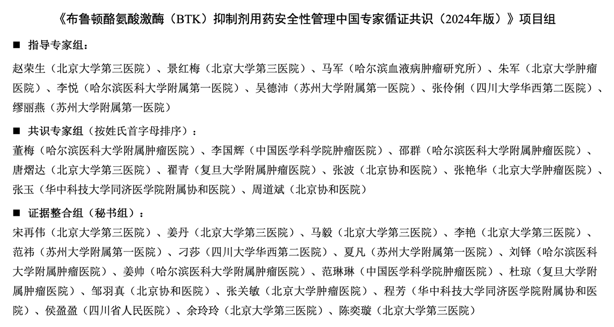 《共识》经中国药学会循证药学专业委员会批准,在中国药学会医院药学专业委员会、中国药理学会治疗药物监测研究专业委员会、中国临床肿瘤学会(CSCO)淋巴瘤专家委员会、中国临床肿瘤学会(CSCO)白血病专家委员会、中国抗癌协会(CACA)整合肿瘤心脏病学分会、中华医学会血液学分会、海峡两岸医药卫生交流协会医院药学专业委员会等支持下完成制订。专家成员涵盖血液学、心血管内科学、肿瘤心脏病学、临床药学、循证医学等专业。