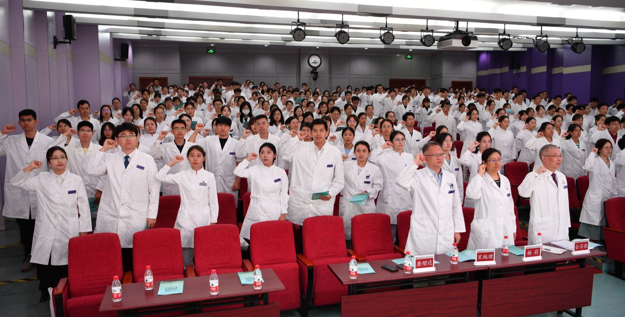 接下来的授白衣环节,新职工们面容庄重,目光坚定,院领导把象征职业使命和荣誉的白衣交到他们手中,传递着老一辈三院人对年轻一代寄予的厚望与深切关怀。